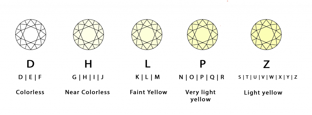 D étant un diamant parfaitement blanc et incolore, les autres seront teintés de nuances légères à soutenues.