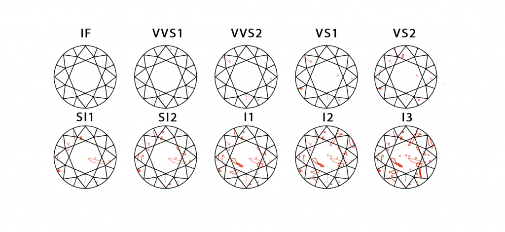 Les diamants présentent des imperfections sous forme d’inclusions. Les diamants sans aucune inclusion sont extrêmement rares. Ces inclusions prennent la forme de cristaux, de nuages ou de plumes. Elles sont invisibles à l’œil nu, et sont étudiées avec une loupe de grossissement X10.