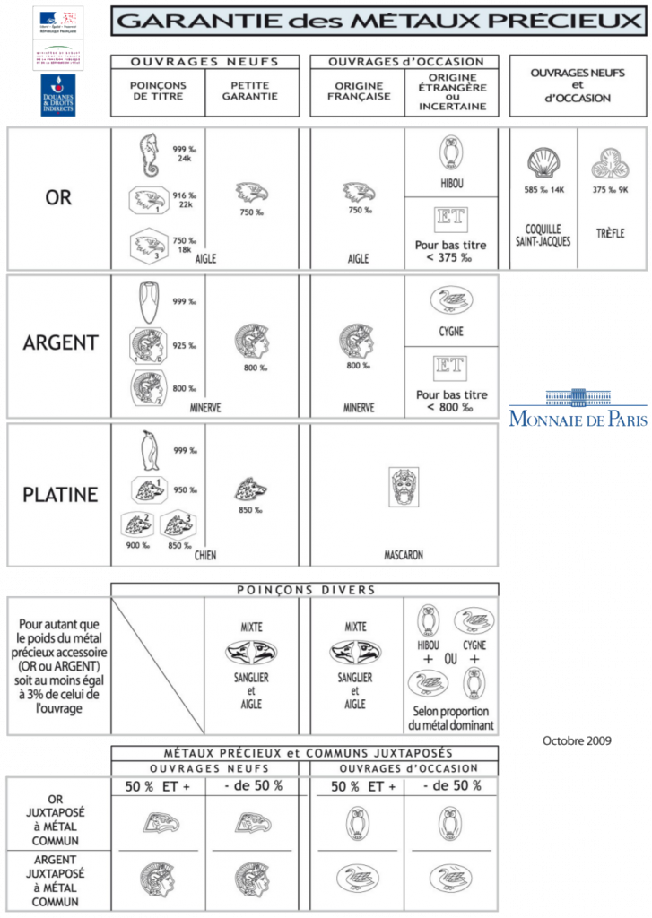 Pour chaque bijoux en or, argent et platine, il doit figurer un poinçon apposé par le bijoutier lors de la création d’un bijou. Les poinçons permettent de connaitre le nombre de carats.