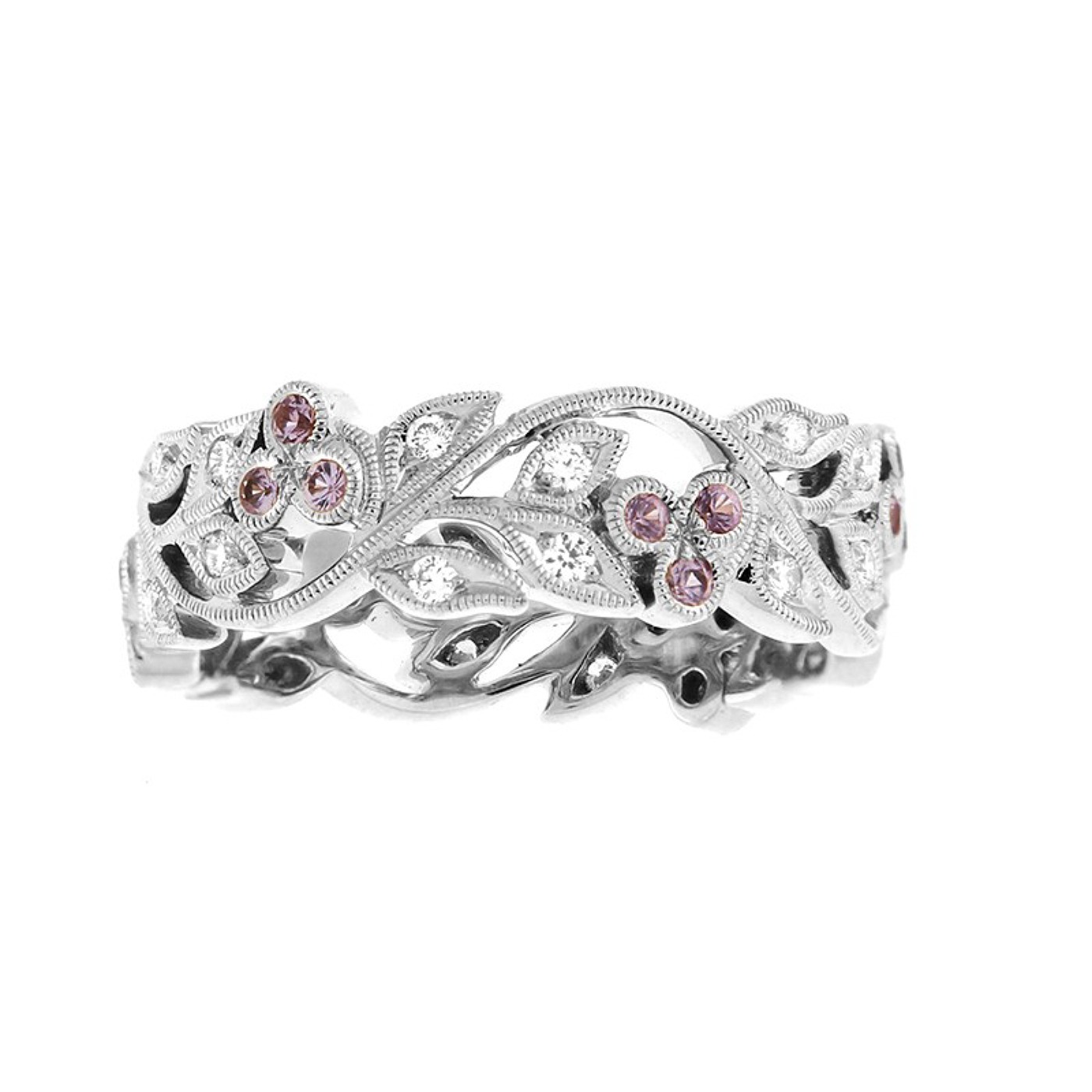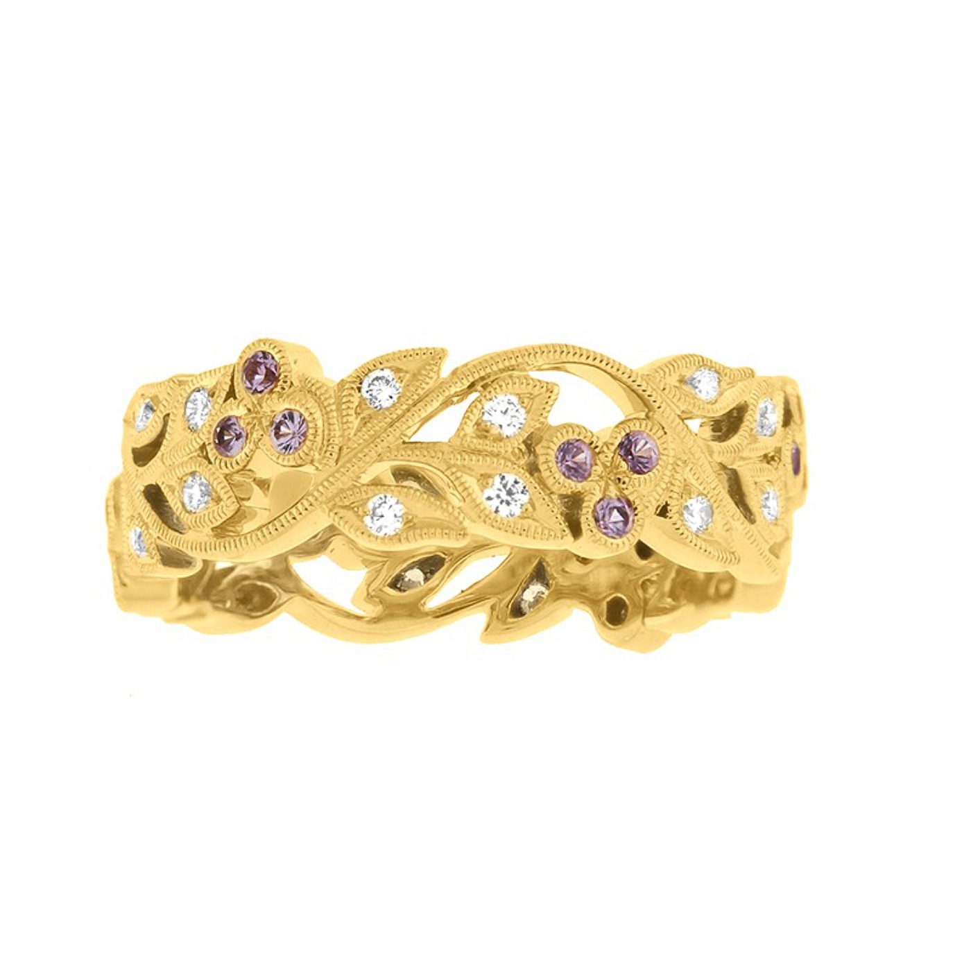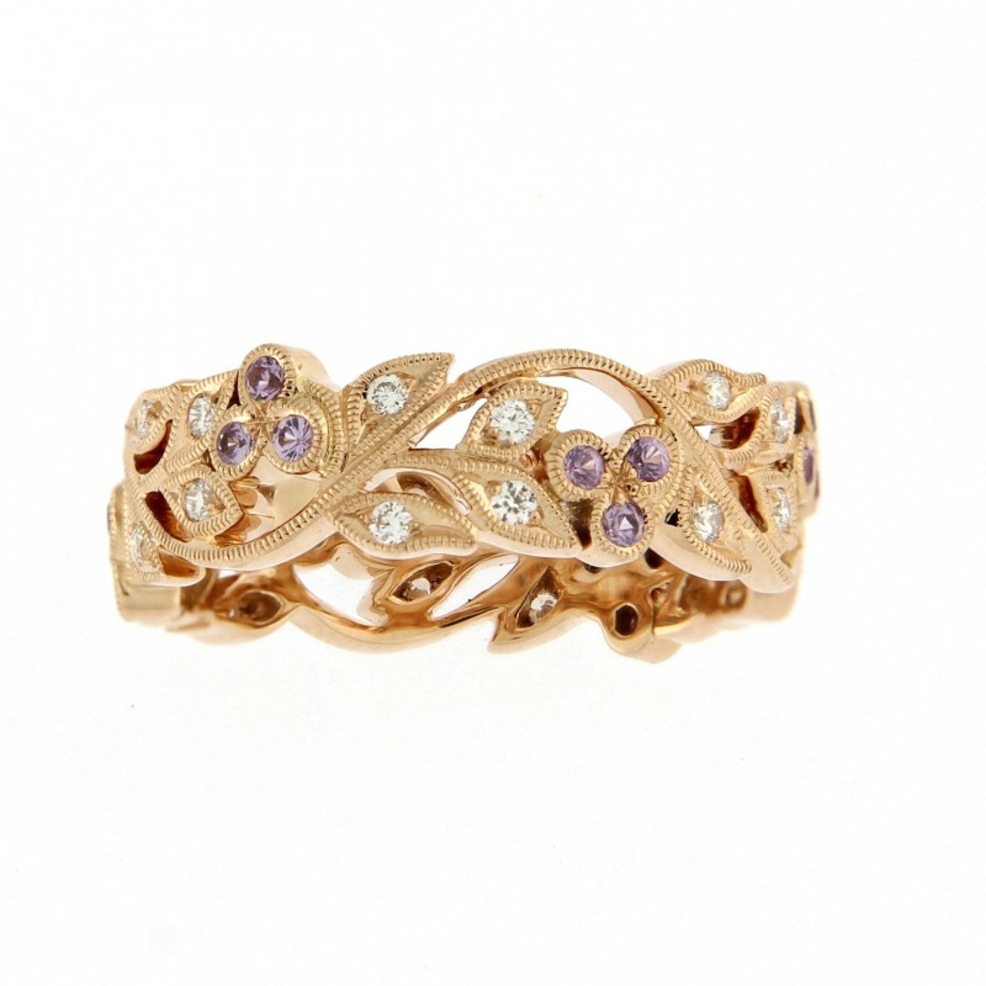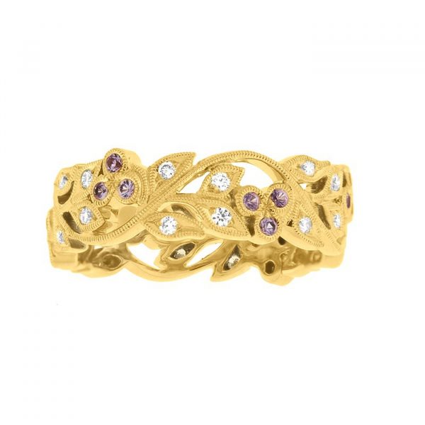 Élégante bague dentelle d’une largeur de 6 millimètres, sublimés par 24 diamants (0.20 carat) et de 18 saphirs violet (0.18 carat)