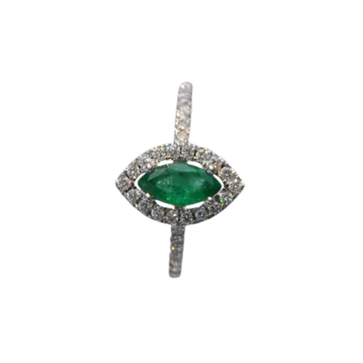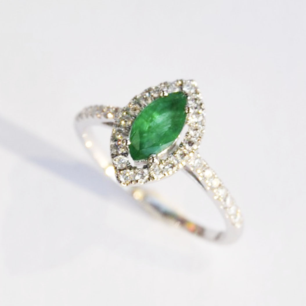 Belle émeraude centrale (0.49 carat) taille navette et son serti 4 griffes.