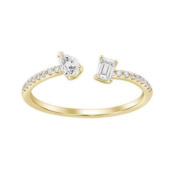 Bague duo solitaire au design original, composée d’un diamant poire et d’un diamant baguette, tous deux sertis à griffes dans un montage classique.