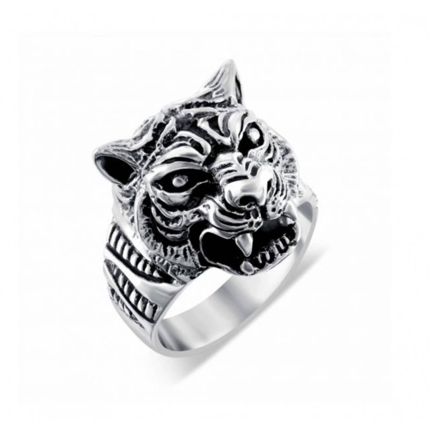 Bague Tête de tigre corps de bague poli miroir, motif argent oxydé.
