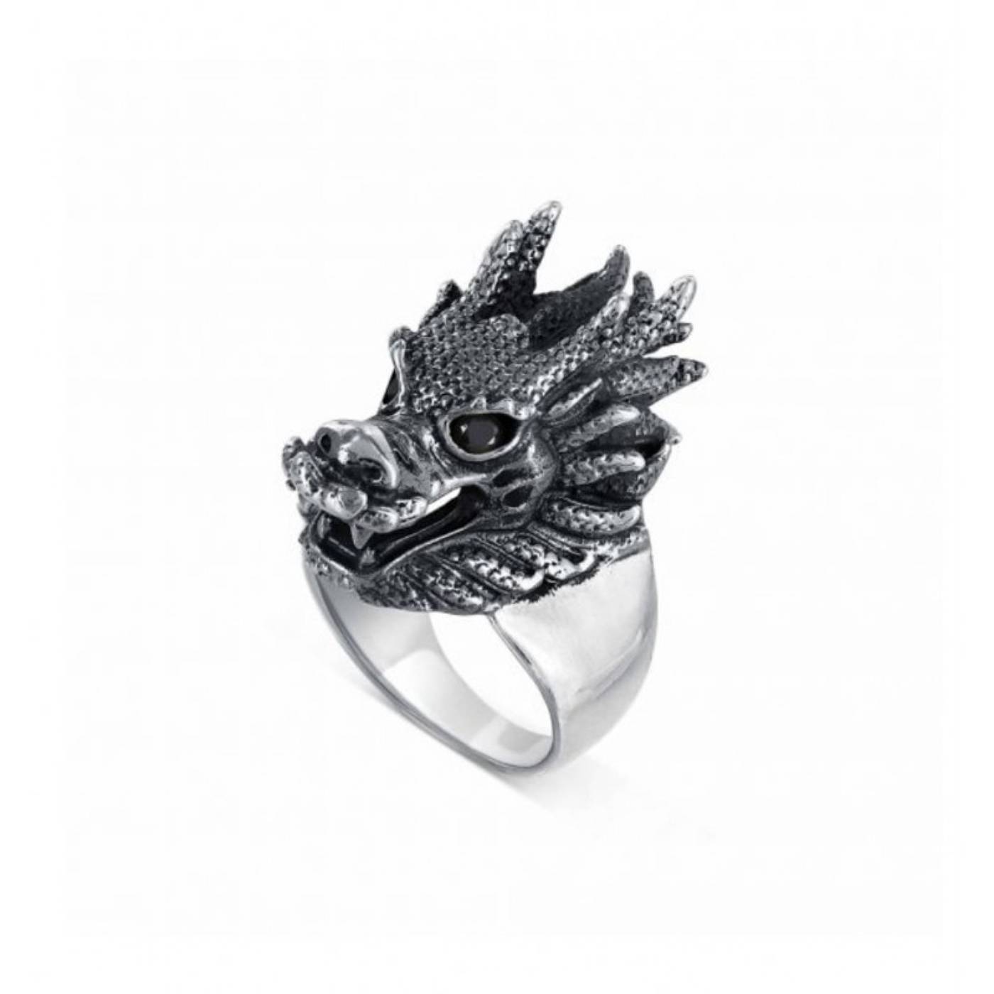 Bague Tête de dragon corps de bague poli miroir, motif argent oxydé.