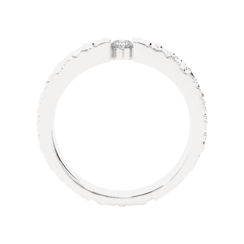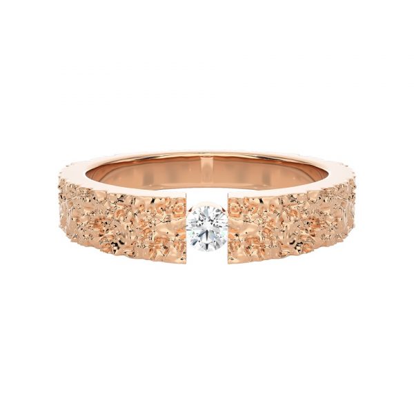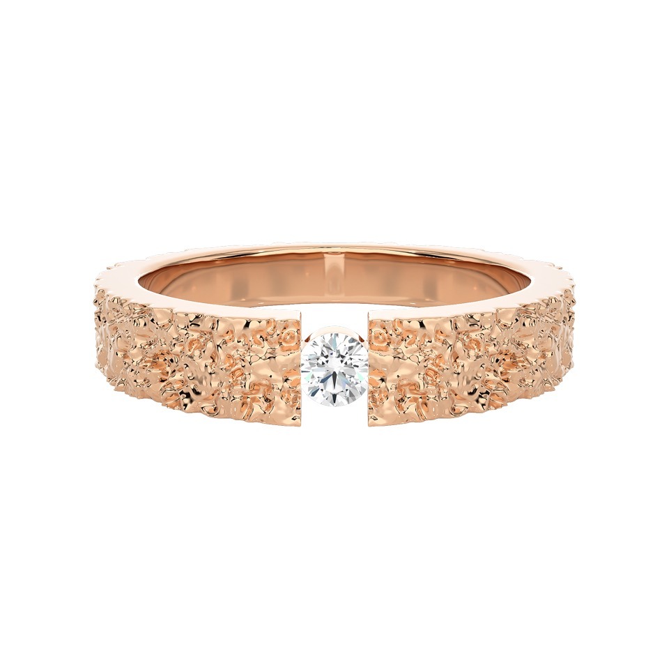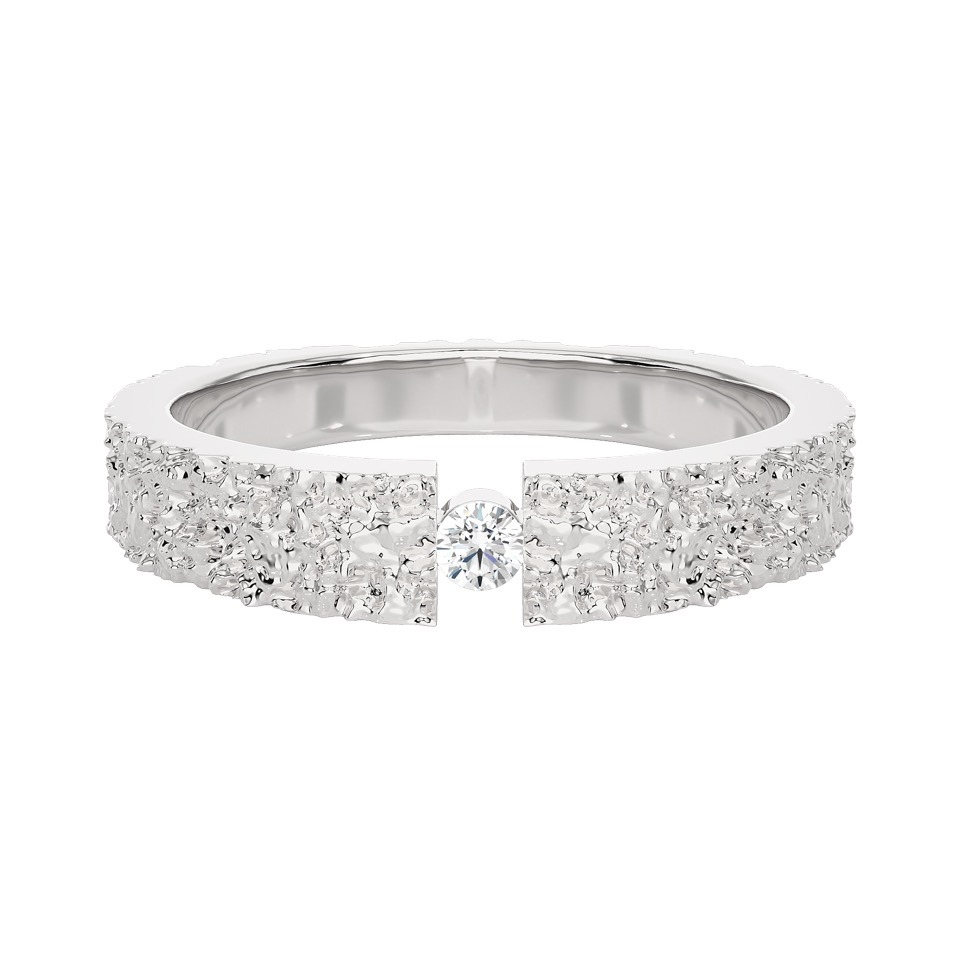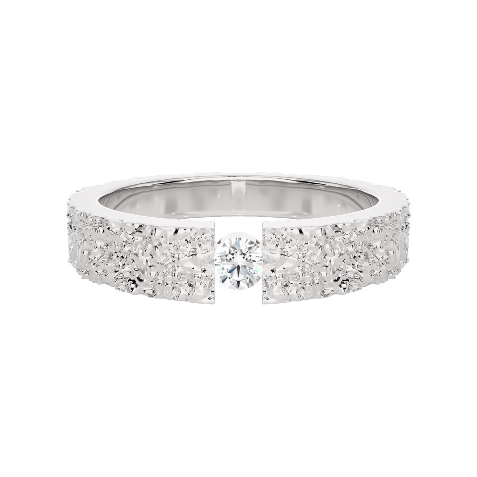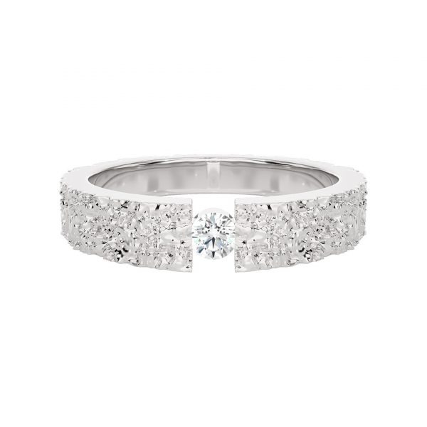 Le diamant, subtilement suspendu, capte la lumière et attire le regard, parfaitement mis en valeur dans ce design audacieux.