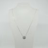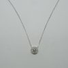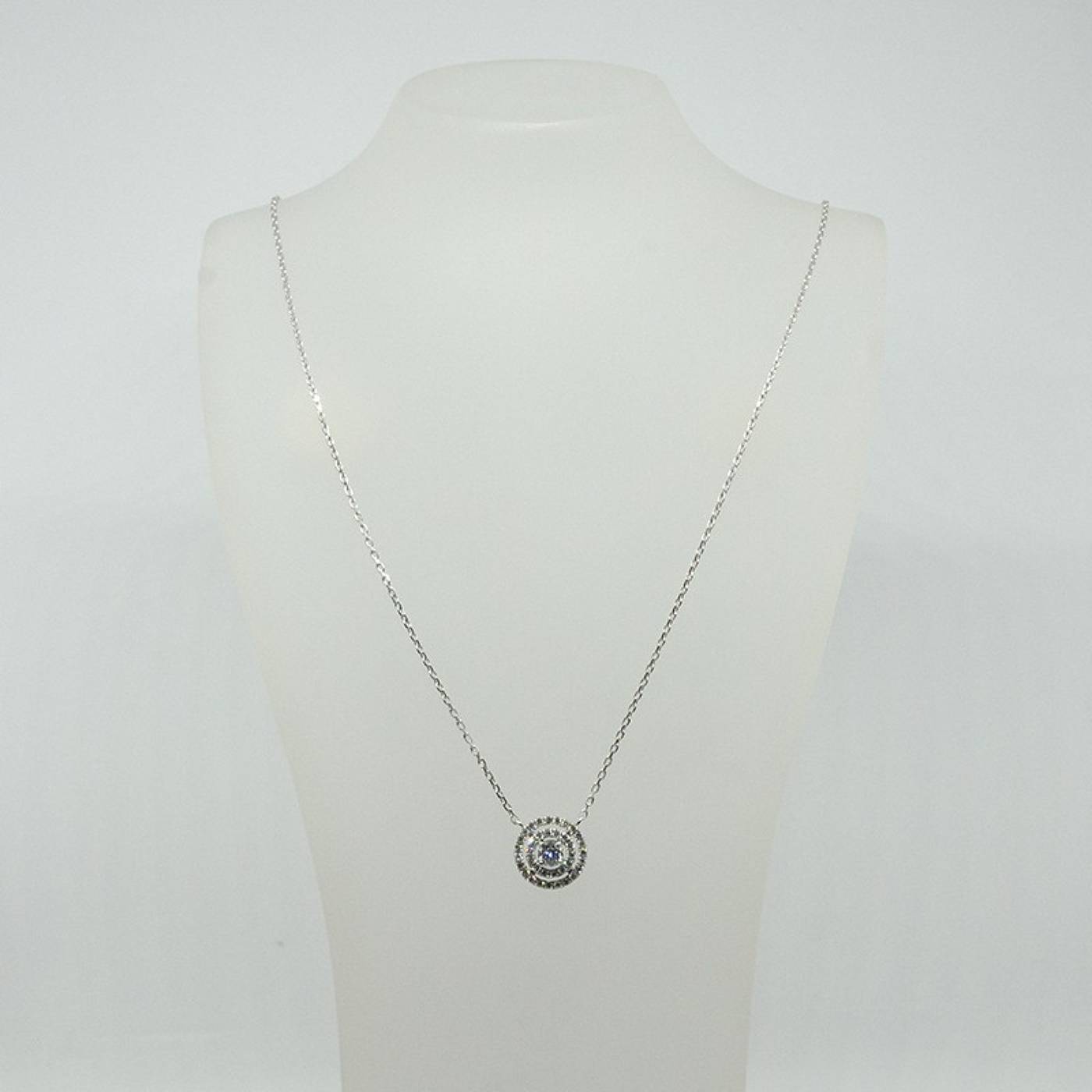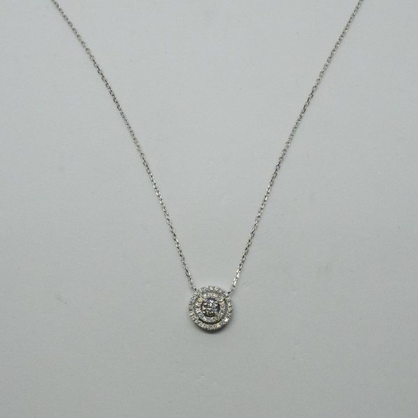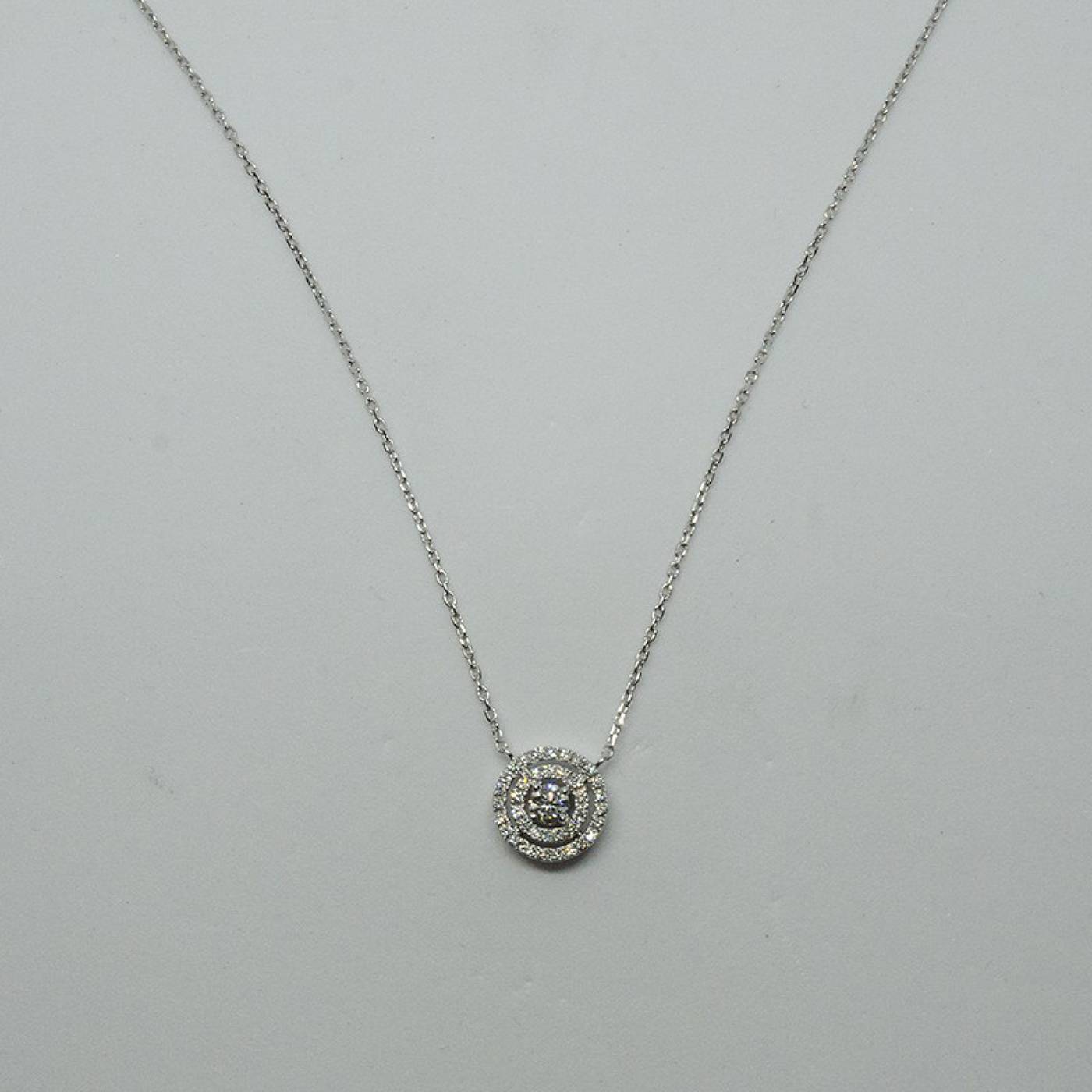 Collier solitaire avec un centre diamant H/SI et un double entourage diamant sur une chaîne forçat en or blanc 750/1000.