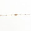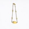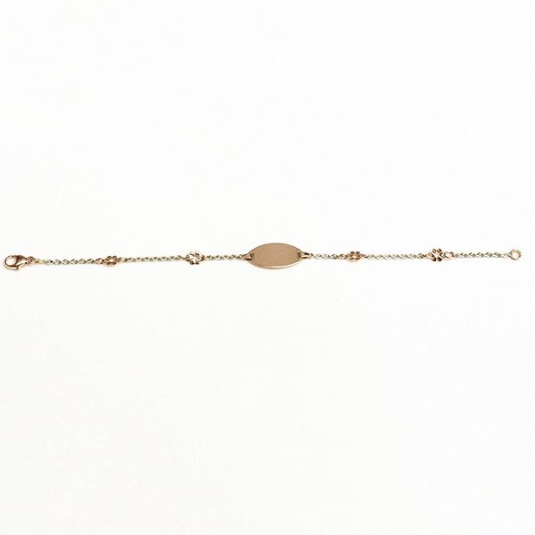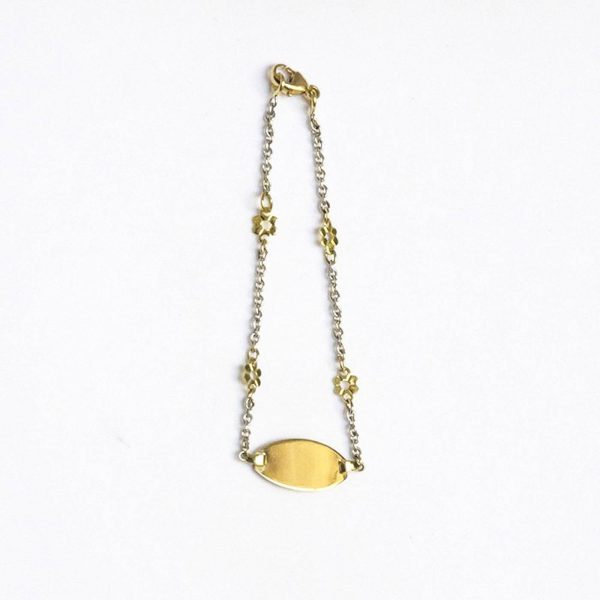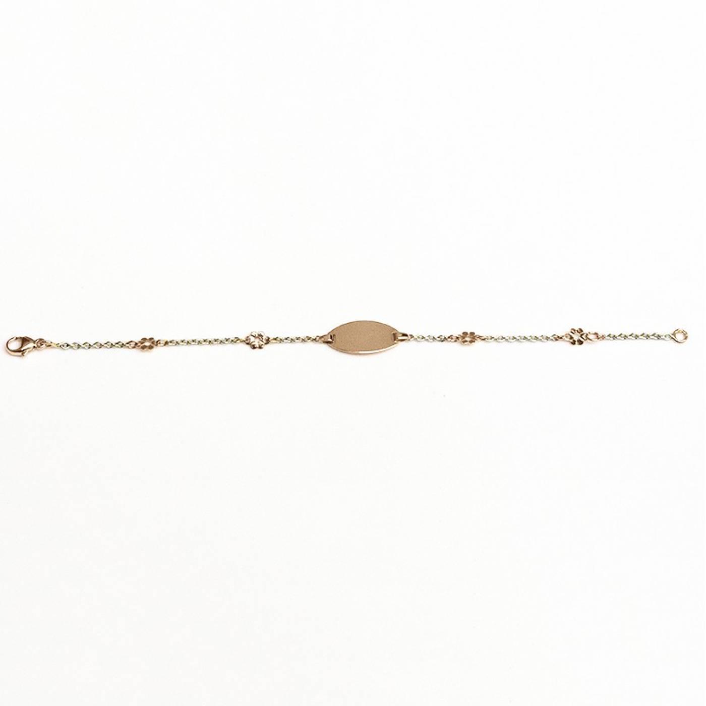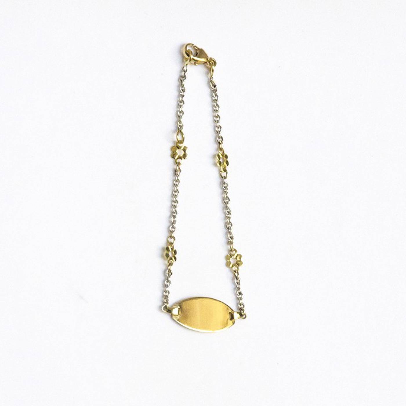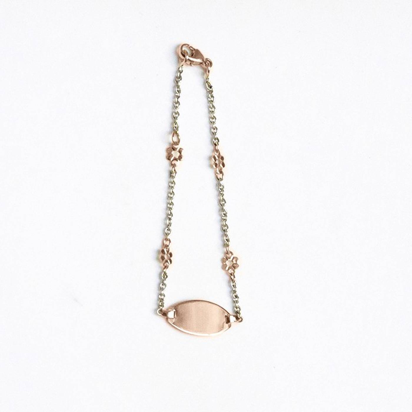Gourmette composée d’une chaîne forçat ronde en or blanc 750/1000 intercalée avec des fleurs et une plaque ovale à graver en or jaune ou rose 750/1000.