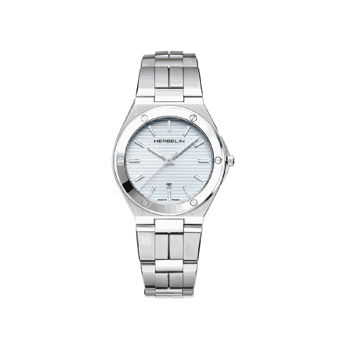 Le fond bleu glacé frappé à l’horizontal apporte une touche d’élégance et de modernité à ce modèle.