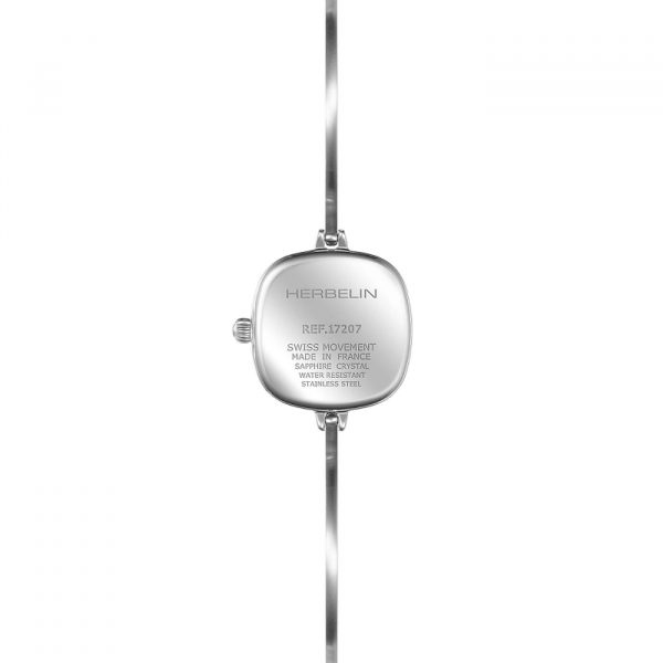 Boitier en acier inoxydable de forme carrée aux angles arrondis.