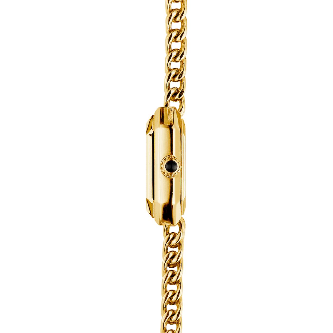 Le bracelet tissé d’une maille fine en PVD or jaune apporte une touche d’éclat à cette montre.