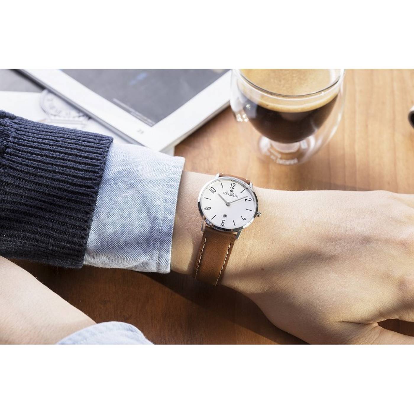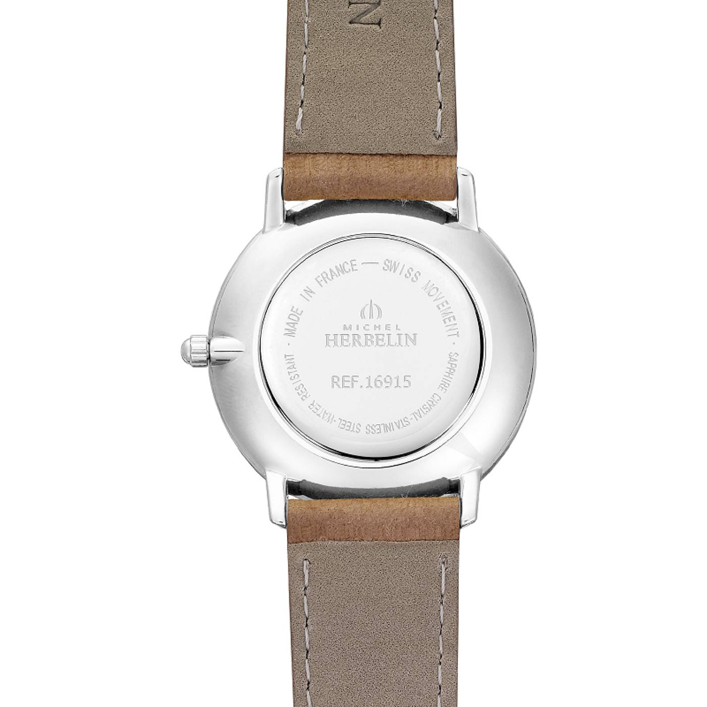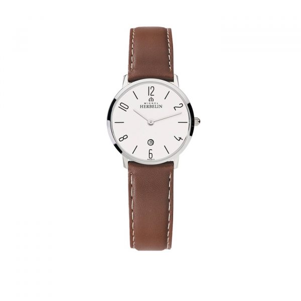 A la fois intemporelle et citadine, ce modèle Michel HERBELIN en acier est paré d’un joli bracelet en cuir marron. Son cadran blanc, marqué par de larges chiffres arabes lui confère une lisibilité optimale.