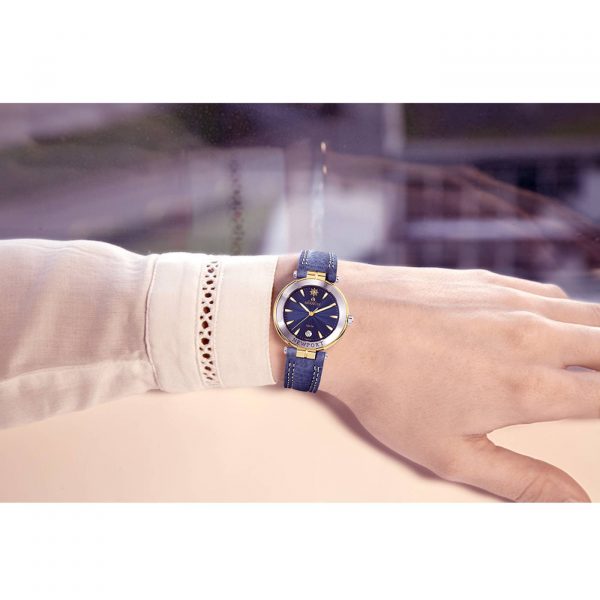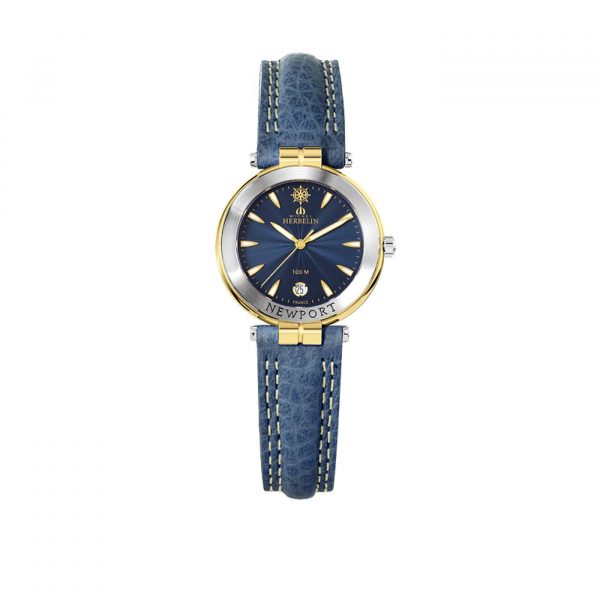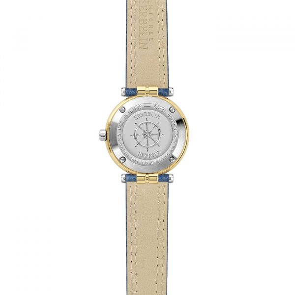 Cette montre Newport, qui se singularise par son bracelet en cuir bleu et son cadran habillé d’une roue de marine à midi, épouse avec délicatesse les courbes des poignets féminins.