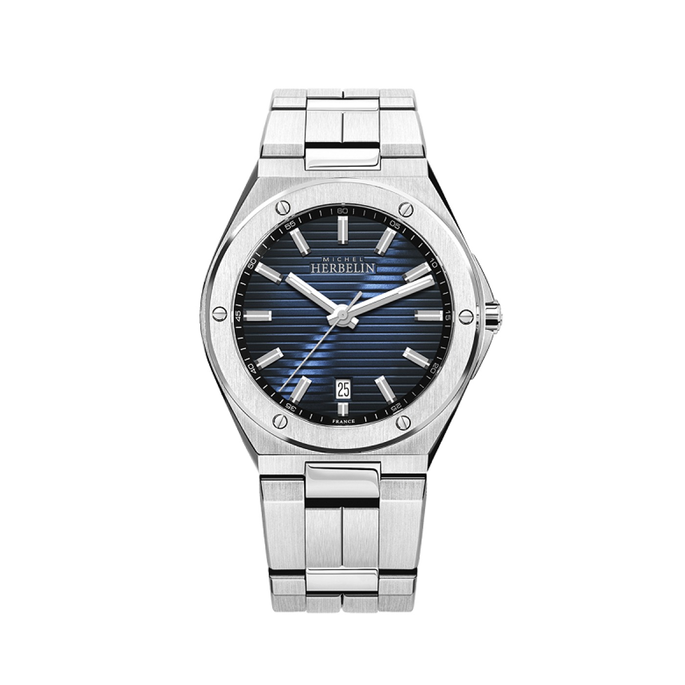 Le fond bleu frappé à l’horizontal reflète chaque éclat de lumière.