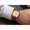 Sobriété et élégance naturelle, une montre chic en toutes circonstances. Cette ligne fait écho aux modèles vintage avec une boite carrée, cambrée qui s’adoucit légèrement aux quatre angles. Munie d’un cadran blanc cassé et montée sur un bracelet en cuir gold cette montre habille les poignets masculins avec élégance.
