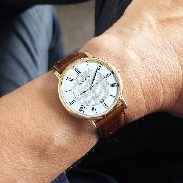 Cette montre Michel HERBELIN, munie d’un boitier en PVD or jaune et d’un bracelet en cuir véritable marron, épouse tous les poignets avec distinction. Son cadran animé de chiffres romains reflète le classicisme de ce modèle sobre et traditionnel.