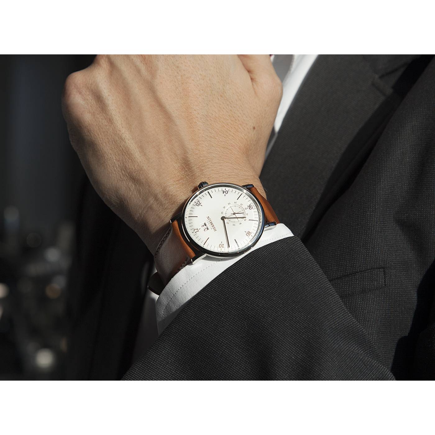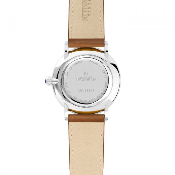 Cette montre Michel HERBELIN est équipée d’un boîtier moderne, de 40 mm de diamètre à la carrure toute en rondeur, qui apporte une touche de modernité à son allure vintage. L’Inspiration dévoile un cadran blanc ponctué d’index bâtons affinés et de chiffres arabes pairs noirs offrant ainsi précision et lisibilité de l’heure.