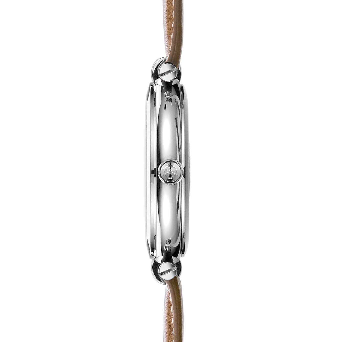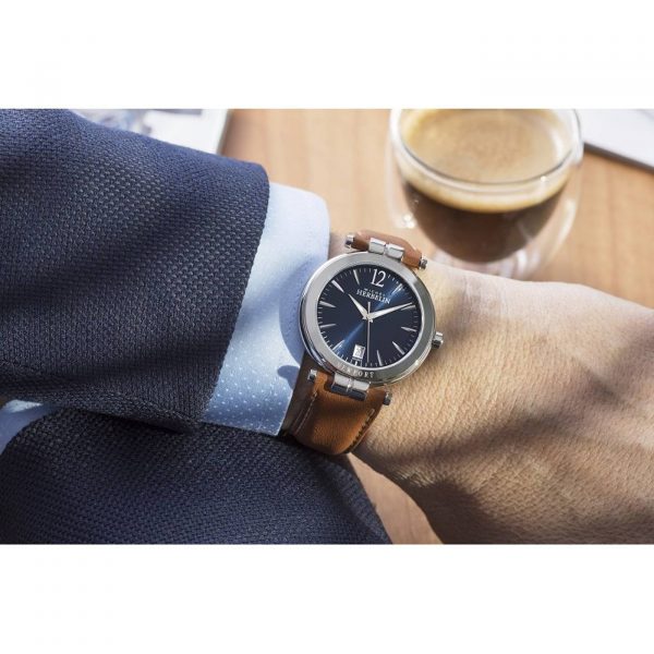 Alliance parfaite entre son cadran bleu et son bracelet en cuir gold, cette montre Michel Herbelin reflète classicisme et raffinement. Marqué par des index argent et un guichet date à 6h elle épouse les poignets masculins avec inspiration et élégance.